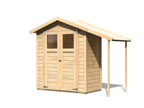 Základní model dřevěného domku pro vaši zahradu. Tento model má sedlovou střechu a dvoukřídlé dveře na pantech s oknem v každém křídle. Stavebním materiálem domku jsou dřevěné profily síly 14 mm perfektně vyfrézované ze severského smrku. Dodáváme jako stavebnici v rozloženém stavu, kde stěny tvoří předpřipravené menší panely, které pouze sešroubujete k sobě a střechu tvoří celistvá deska. To garantuje extrémně jednoduchou montáž, kterou zvládne každý český kutil.
