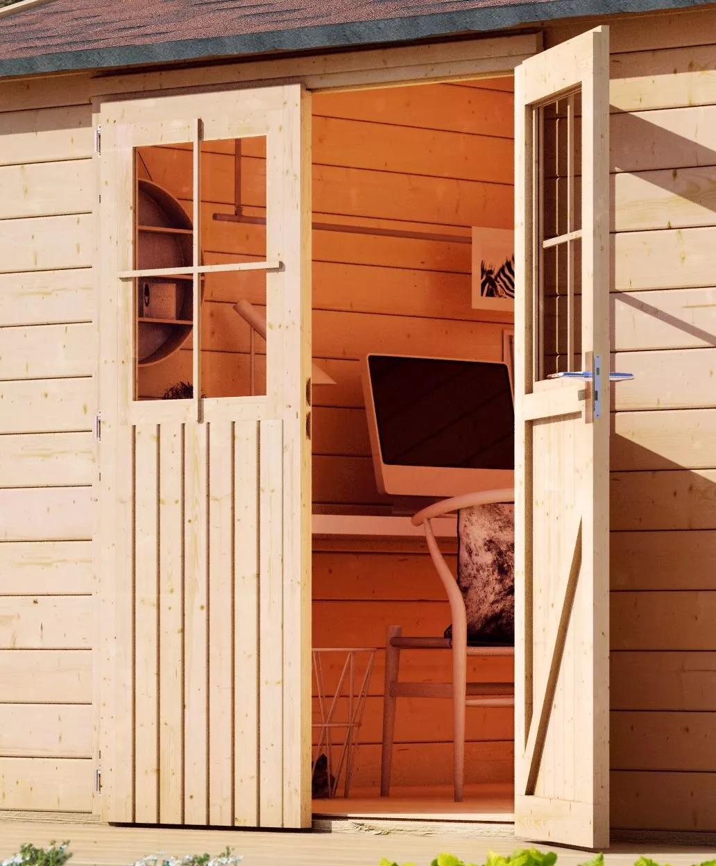 Základní model dřevěného domku pro vaši zahradu. Tento model má sedlovou střechu a dvoukřídlé dveře na pantech s oknem v každém křídle. Stavebním materiálem domku jsou dřevěné profily síly 38 mm perfektně vyfrézované ze severského smrku. Dodáváme jako stavebnici v rozloženém stavu. Velkou výhodou této řady je patentovaný rohový spoj 6-Plus. Společně tak zajišťují nejen odolnou a stabilní konstrukci ale také robustní celkový vzhled. Střechu tvoří celistvá deska. To garantuje extrémně jednoduchou montáž, kterou zvládne každý český kutil.