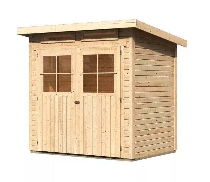 Základní model dřevěného domku pro vaši zahradu. Tento model má pultovou střechu a dvoukřídlé dveře na pantech s oknem v každém křídle. Stavebním materiálem domku jsou dřevěné profily síly 19 mm perfektně vyfrézované ze severského smrku. Dodáváme jako stavebnici v rozloženém stavu, kde stěny tvoří jednotlivé dřevěné profily, které pouze sesadíte k sobě a sešroubujete, střechu tvoří celistvá deska. To garantuje extrémně jednoduchou montáž, kterou zvládne každý český kutil.