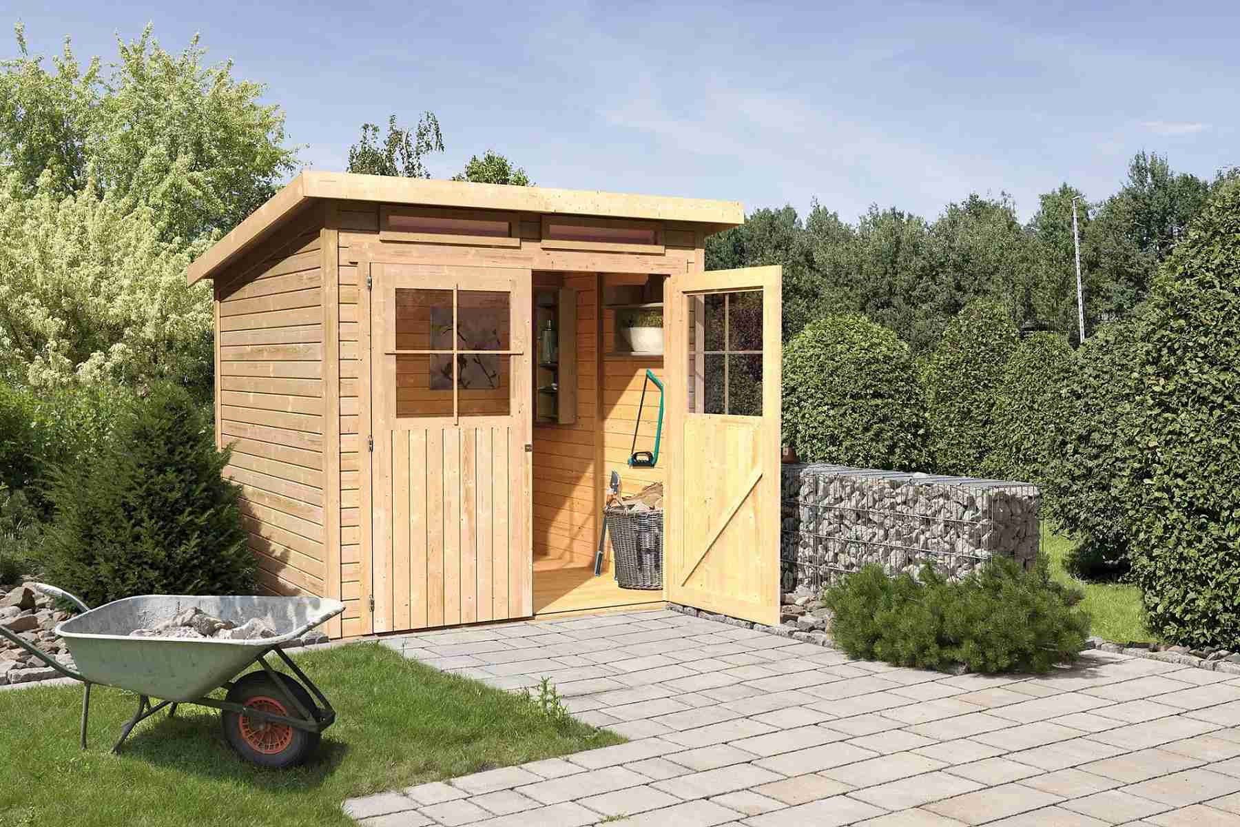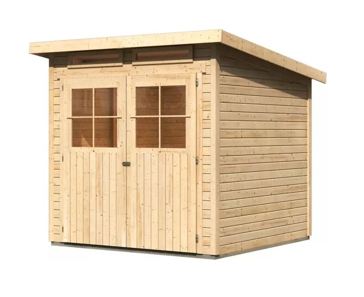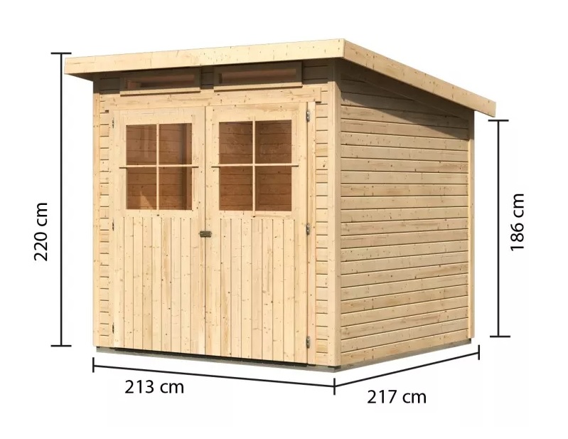 Základní model dřevěného domku pro vaši zahradu. Tento model má pultovou střechu a dvoukřídlé dveře na pantech s oknem v každém křídle. Stavebním materiálem domku jsou dřevěné profily síly 19 mm perfektně vyfrézované ze severského smrku. Dodáváme jako stavebnici v rozloženém stavu, kde stěny tvoří jednotlivé dřevěné profily, které pouze sesadíte k sobě a sešroubujete, střechu tvoří celistvá deska. To garantuje extrémně jednoduchou montáž, kterou zvládne každý český kutil.