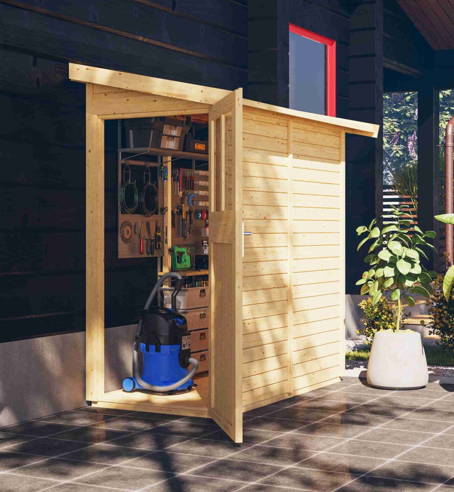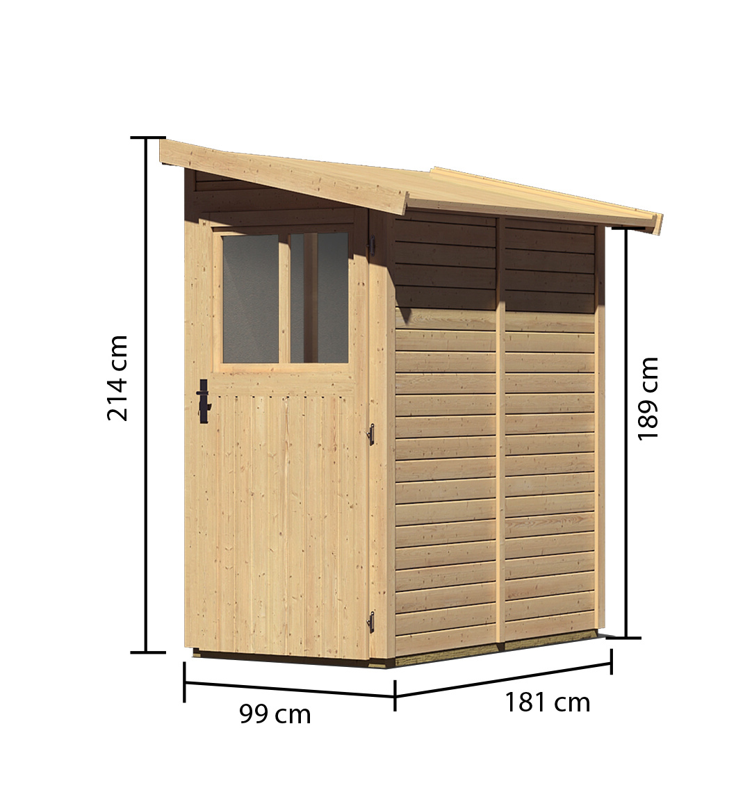 Dřevěný domek ke zdi. V domku můžete uskladnit zahradní techniku, nářadí nebo si v něm vybudovat kutilskou dílnu. Domek má šikmou střechu a jedny jednokřídlé dveře na pantech s oknem. Stavebním materiálem domku jsou dřevěné profily síly 19 mm perfektně vyfrézované ze severského smrku. Dodáváme jako stavebnici v rozloženém stavu, kde stěny tvoří jednotlivé dřevěné profily, které pouze sesadíte k sobě a sešroubujete, střechu tvoří celistvá deska. To garantuje extrémně jednoduchou montáž, kterou zvládne každý český kutil.