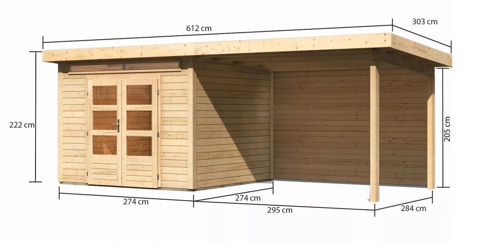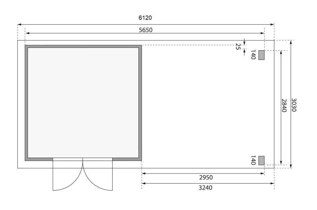 Tato verze domku obsahuje přístavek včetně zadní stěny délky 320 cm montovatelný zprava nebo zleva.