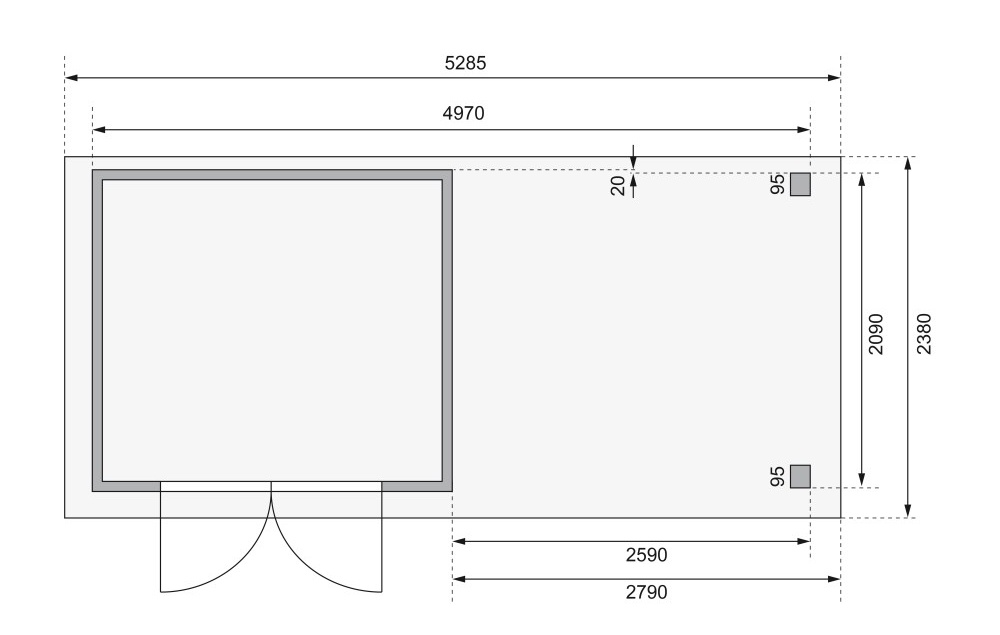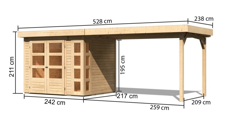 Tato verze domku obsahuje i přístavek délky 280 cm.