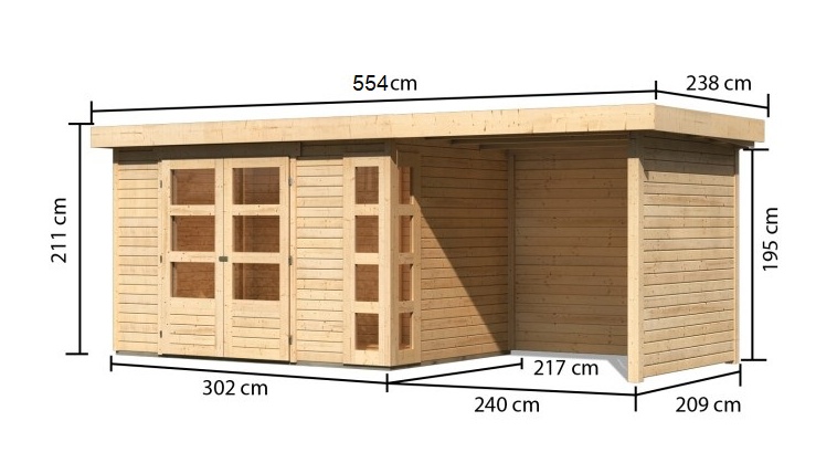 Tato verze domku obsahuje i přístavek včetně zadní a boční stěny délky 240 cm.