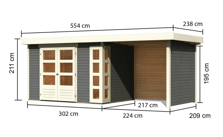 Tato verze domku obsahuje i přístavek včetně zadní a boční stěny délky 240 cm.