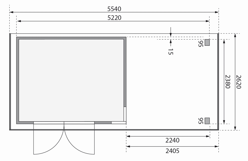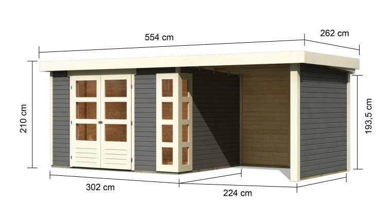Tato verze domku obsahuje i přístavek včetně zadní a boční stěny délky 240 cm.