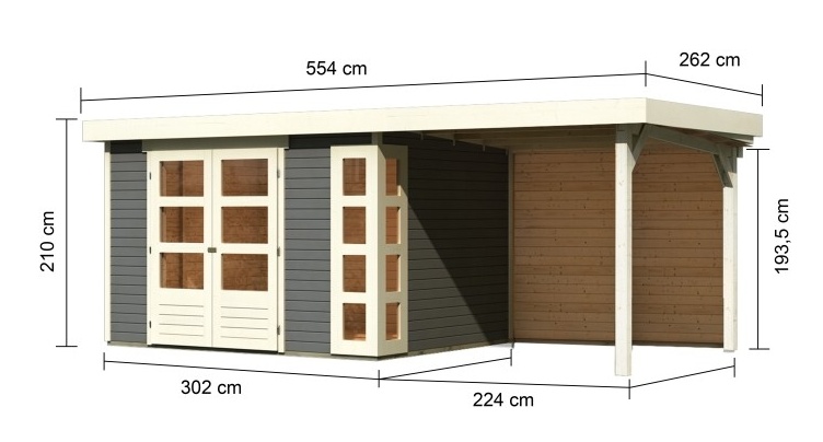 Tato verze domku obsahuje i přístavek včetně zadní a boční stěny délky 240 cm.