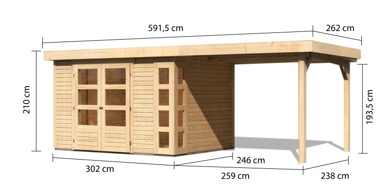 Tato verze domku obsahuje i přístavek délky 280 cm.
