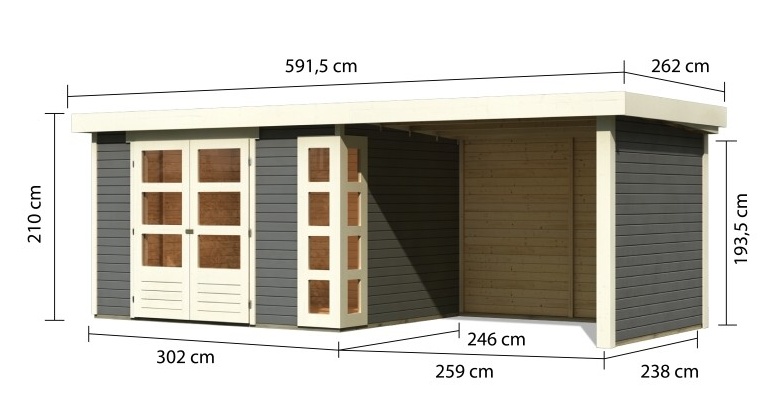 Tato verze domku obsahuje i přístavek včetně zadní a boční stěny délky 280 cm.