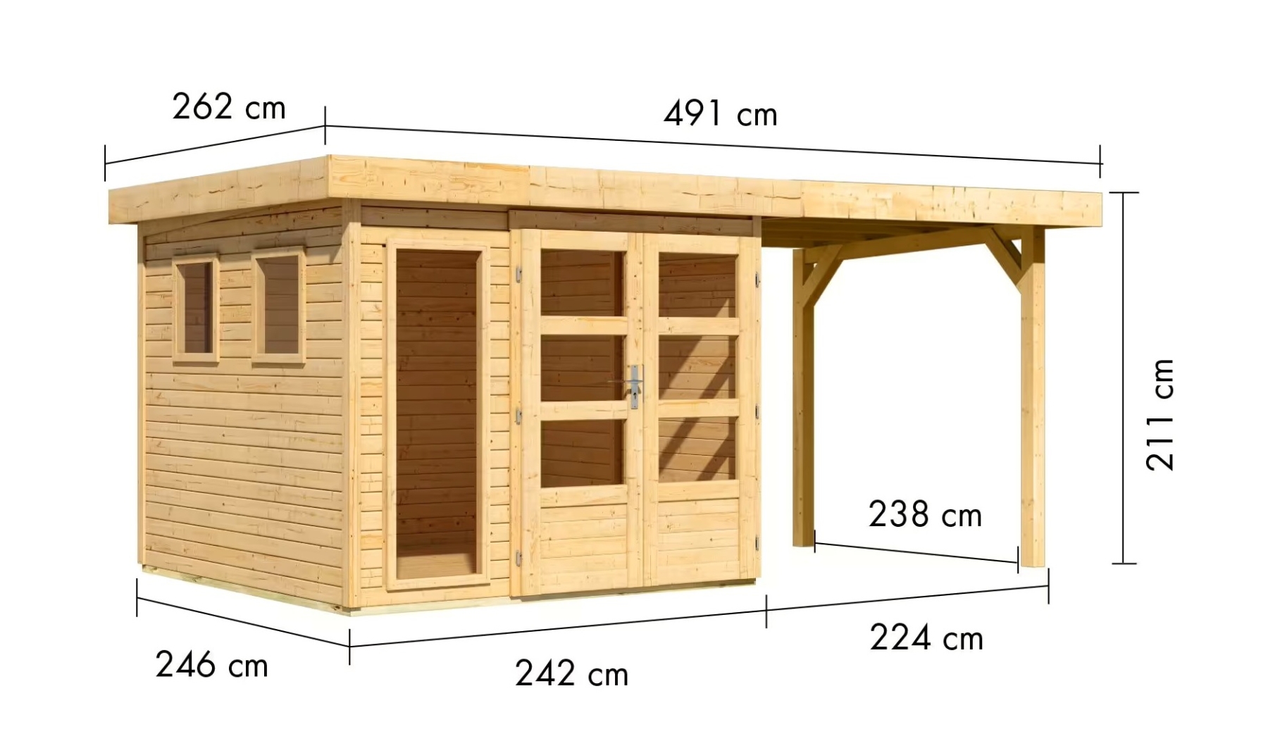 Tato verze domku obsahuje otevřený přístavek délky 240 cm.