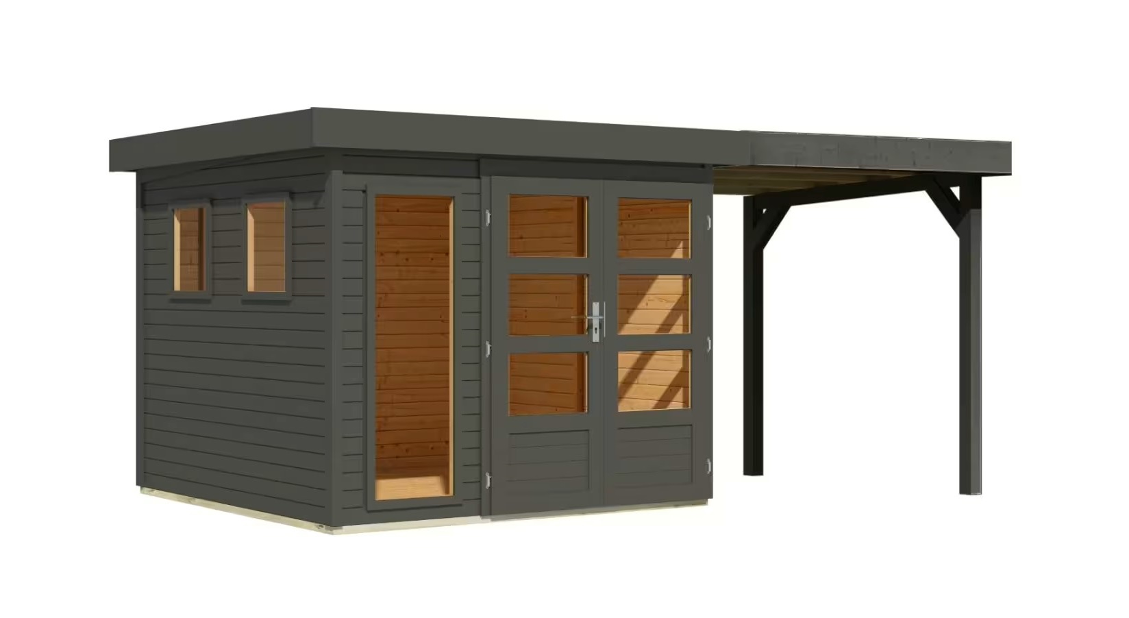 Tento model domku dodáváme v profesionálním nátěru KARIBU (odstín terragrau RAL 0604005):