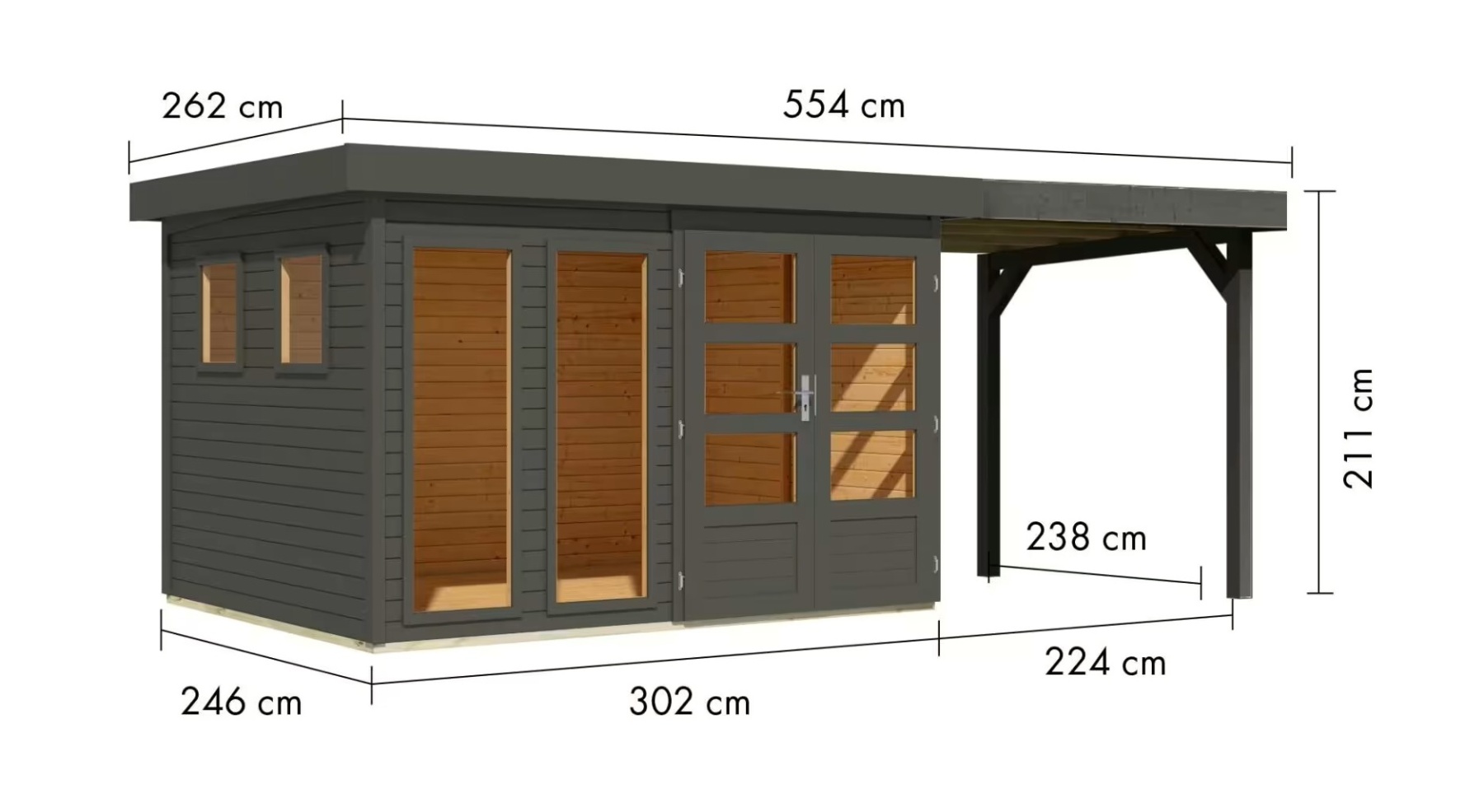 Tato verze domku obsahuje otevřený přístavek délky 240 cm.