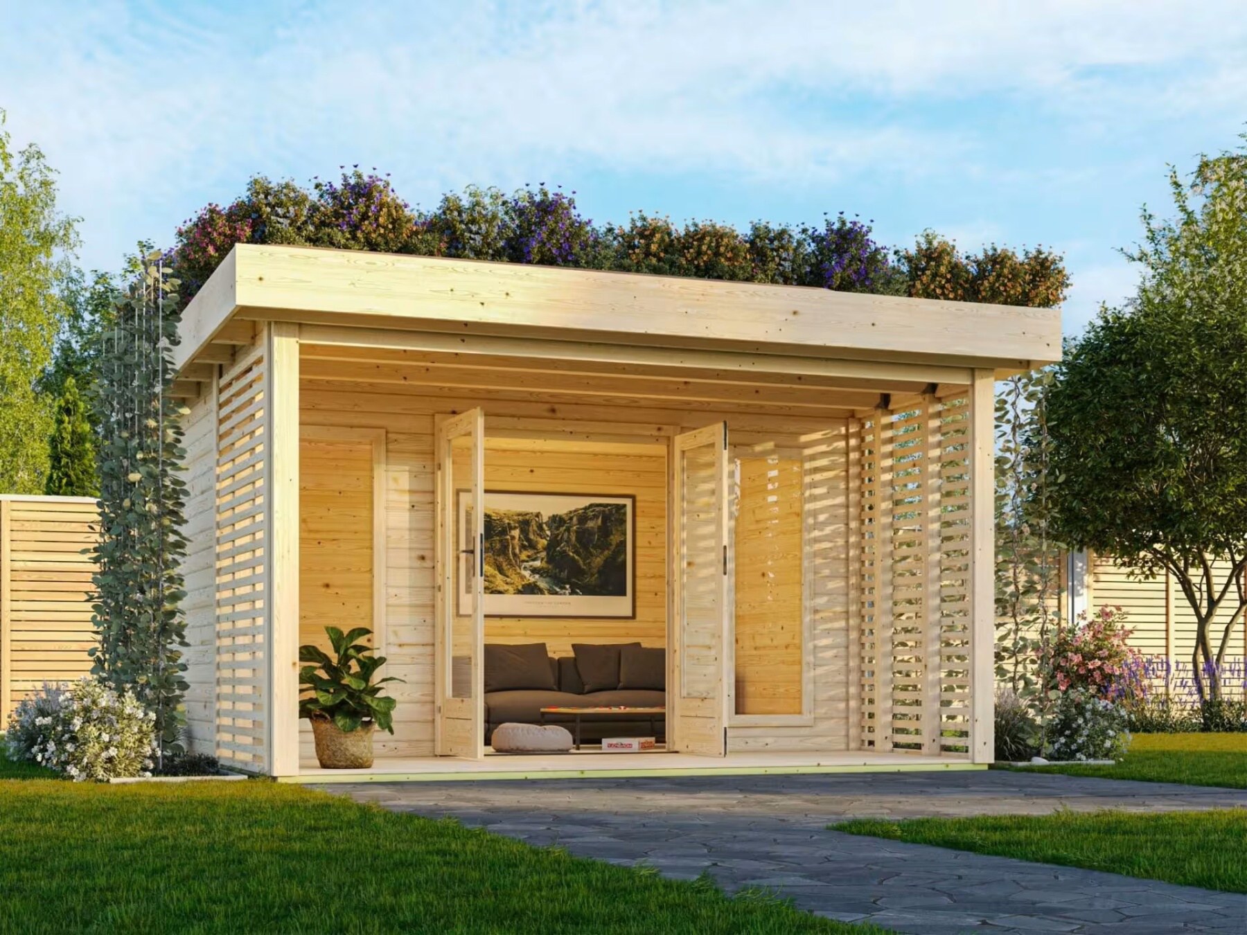 Zahradní domek LILY z vysoce kvalitního severského smrku se sílou profilu 38 mm a vodoodpudivou profilací nabízí robustní konstrukci s nosností střechy až 185 kg/m2 (po instalaci zelené střechy stále 85 kg/m2). Součástí dodávky je veškerý potřebný materiál pro zhotovení zelené střechy, včetně střešní krytiny. Domek disponuje integrovanou terasou o hloubce 150 cm, osazenou 18 mm silnými terasovými prkny tlakově impregnovanými (KDI). 19 mm silná střecha z masivního dřeva, pevné rohové spoje a lamelové zástěny po stranách terasy zajišťují ochranu před nepříznivým počasím i soukromí. Zabezpečení domku zajišťuje cylindrický zámek se třemi klíči. Součástí balení je také tlakem impregnovaná podkladová konstrukce a masivní dřevěná podlaha.
