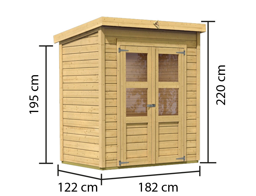 Základní model dřevěného domku pro vaši zahradu. Tento model má pultovou střechu a dvoukřídlé dveře na pantech s oknem v každém křídle. Stavebním materiálem domku jsou dřevěné profily síly 14 mm perfektně vyfrézované ze severského smrku. Dodáváme jako stavebnici v rozloženém stavu, kde stěny tvoří jednotlivé dřevěné profily, které pouze sesadíte k sobě a sešroubujete, střechu tvoří celistvá deska. To garantuje extrémně jednoduchou montáž, kterou zvládne každý český kutil.