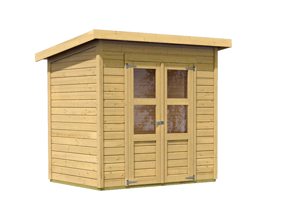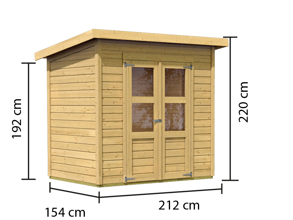 Základní model dřevěného domku pro vaši zahradu. Tento model má pultovou střechu a dvoukřídlé dveře na pantech s oknem v každém křídle. Stavebním materiálem domku jsou dřevěné profily síly 14 mm perfektně vyfrézované ze severského smrku. Dodáváme jako stavebnici v rozloženém stavu, kde stěny tvoří jednotlivé dřevěné profily, které pouze sesadíte k sobě a sešroubujete, střechu tvoří celistvá deska. To garantuje extrémně jednoduchou montáž, kterou zvládne každý český kutil.
