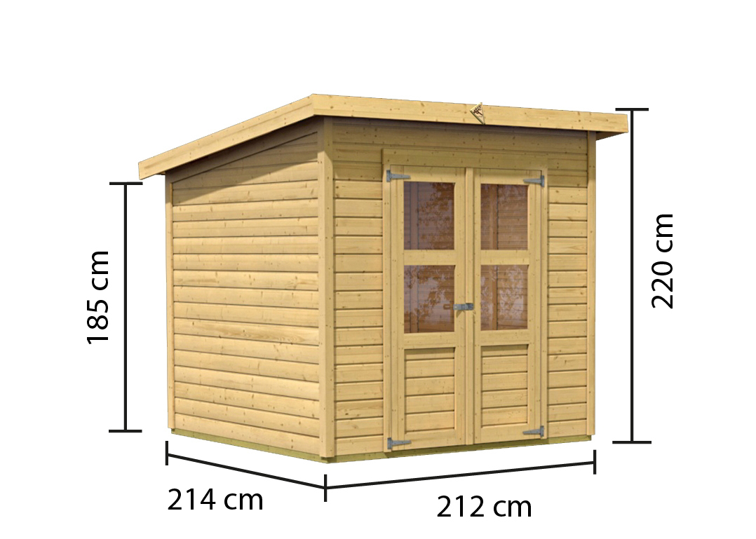 Základní model dřevěného domku pro vaši zahradu. Tento model má pultovou střechu a dvoukřídlé dveře na pantech s oknem v každém křídle. Stavebním materiálem domku jsou dřevěné profily síly 14 mm perfektně vyfrézované ze severského smrku. Dodáváme jako stavebnici v rozloženém stavu, kde stěny tvoří jednotlivé dřevěné profily, které pouze sesadíte k sobě a sešroubujete, střechu tvoří celistvá deska. To garantuje extrémně jednoduchou montáž, kterou zvládne každý český kutil.