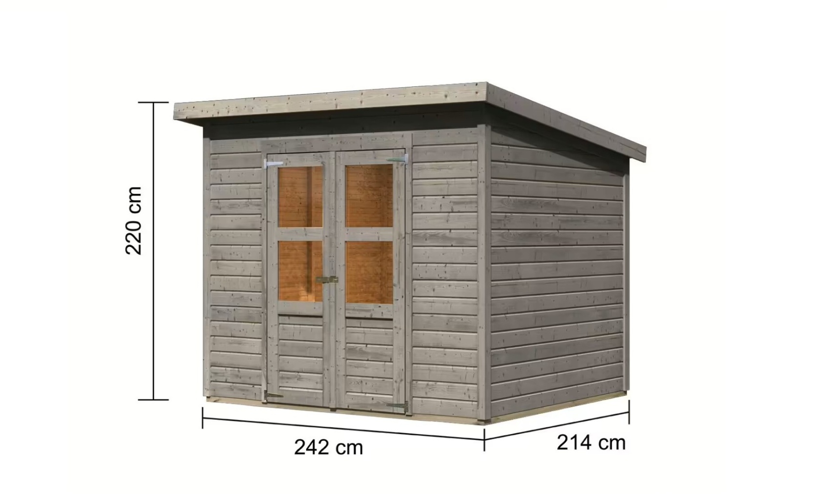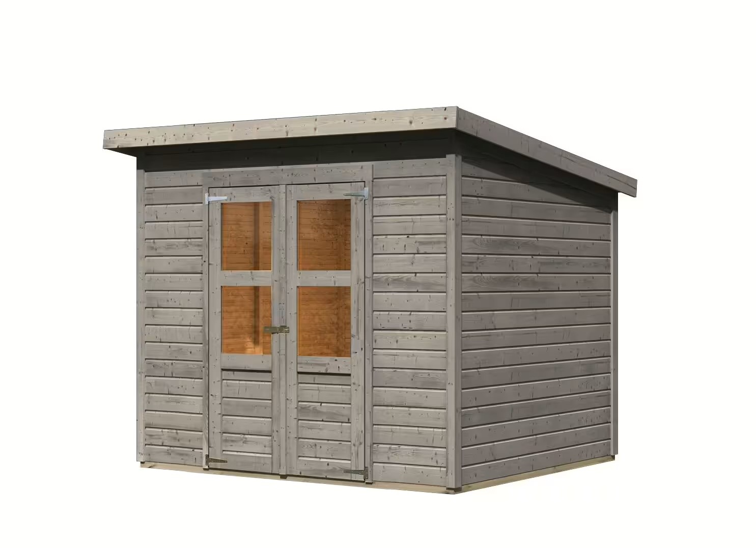 Tento model domku dodáváme v profesionálním nátěru KARIBU (odstín světle šedé RAL 360 60 05):