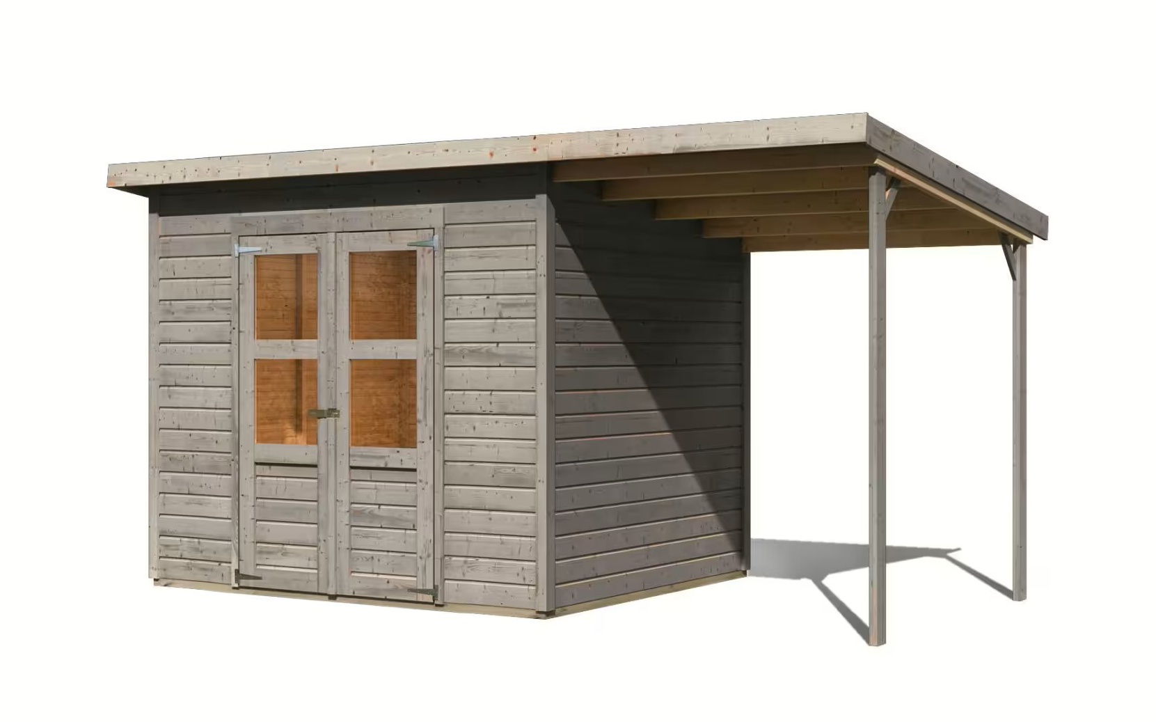 Tento model domku dodáváme v profesionálním nátěru KARIBU (odstín světle šedé RAL 360 60 05):