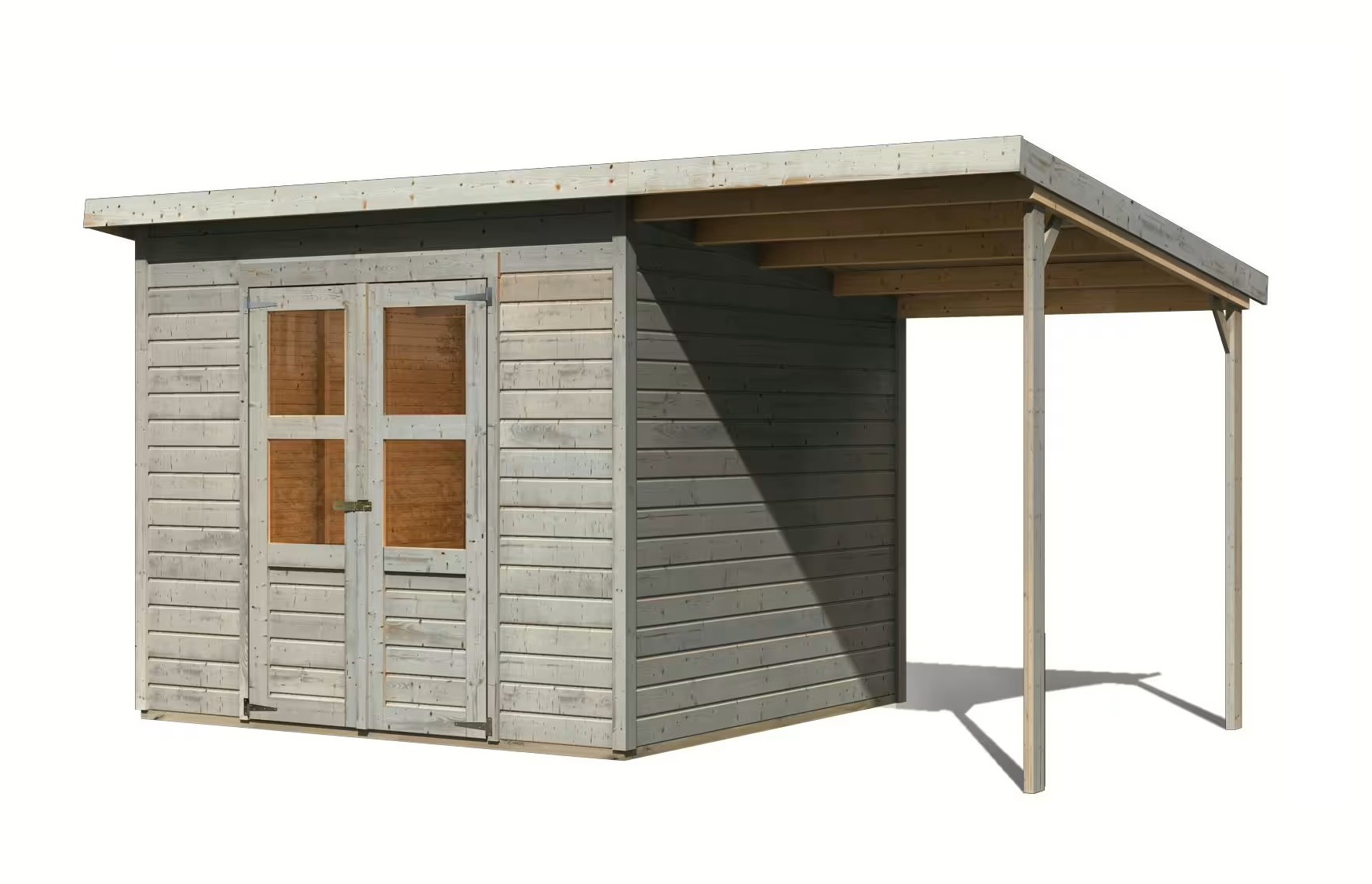 Tento model domku dodáváme v profesionálním nátěru KARIBU (odstín světle šedé RAL 360 60 05):