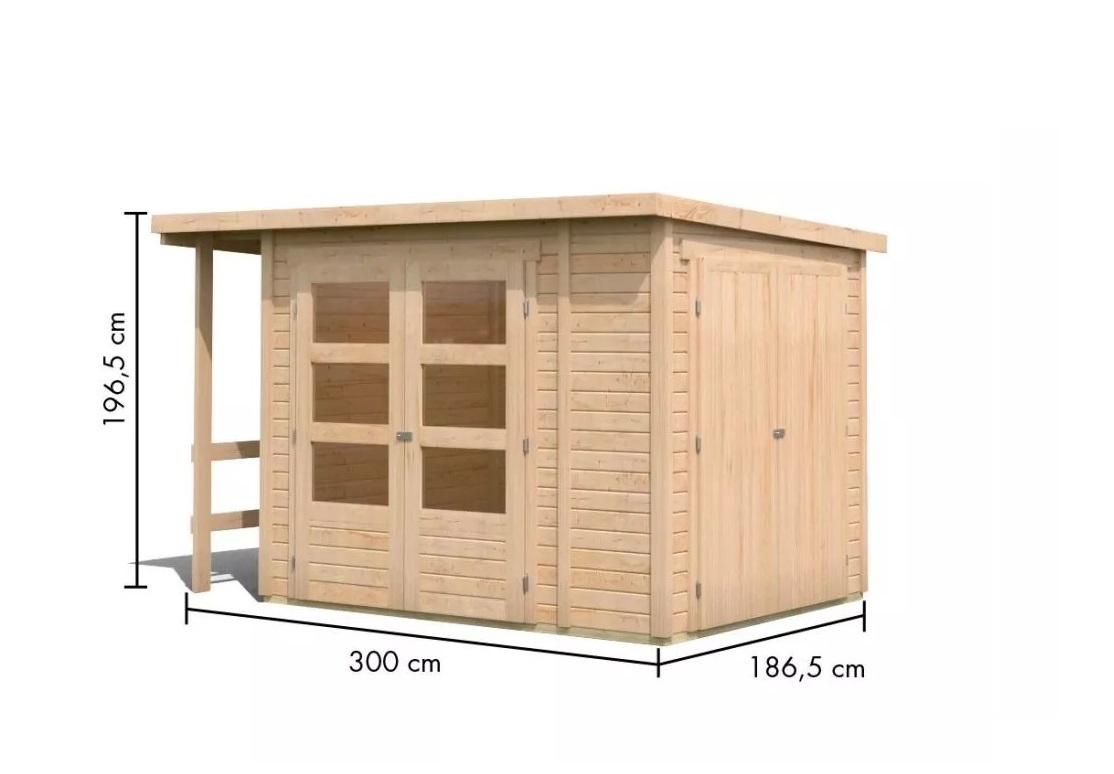 Základní model dřevěného domku pro vaši zahradu. Zvláštnost domku je integrovaná přídavná skříň na boku. Ta s rozměry ( š x h ) 57 x 179 cm nabízí dostatečný prostor pro vaše zahradní nářadí. Tento model má pultovou střechu a dvoukřídlé dveře na pantech s oknem v každém křídle. Stavebním materiálem domku jsou dřevěné profily síly 19 mm perfektně vyfrézované ze severského smrku. Dodáváme jako stavebnici v rozloženém stavu, kde stěny tvoří jednotlivé dřevěné profily, které pouze sesadíte k sobě a sešroubujete, střechu tvoří celistvá deska. To garantuje extrémně jednoduchou montáž, kterou zvládne každý český kutil.
