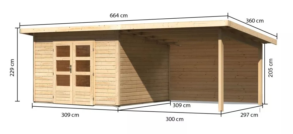 Tato verze domku obsahuje přístavek včetně zadní stěny délky 330 cm montovatelný zprava nebo zleva.