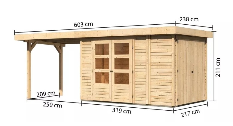 Základní model dřevěného domku pro vaši zahradu. Zvláštnost domku je integrovaná přídavná skříň na boku. Ta s rozměry ( š x h ) 77 x 217 cm nabízí dostatečný prostor pro vaše zahradní nářadí. Tento model má pultovou střechu a dvoukřídlé dveře na pantech s oknem v každém křídle. Stavebním materiálem domku jsou dřevěné profily síly 19 mm perfektně vyfrézované ze severského smrku. Dodáváme jako stavebnici v rozloženém stavu, kde stěny tvoří jednotlivé dřevěné profily, které pouze sesadíte k sobě a sešroubujete, střechu tvoří celistvá deska. To garantuje extrémně jednoduchou montáž, kterou zvládne každý český kutil.