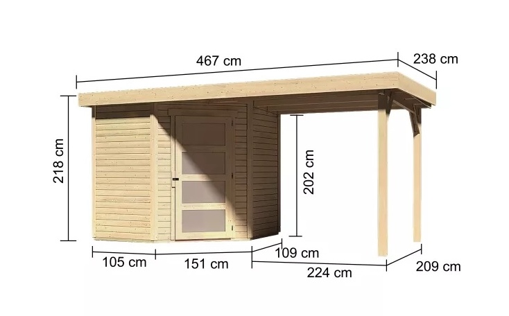 Tato verze domku obsahuje přístavek délky 240 cm montovatelný zprava nebo zleva.