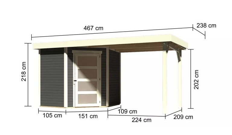 Tato verze domku obsahuje přístavek délky 240 cm montovatelný zprava nebo zleva.