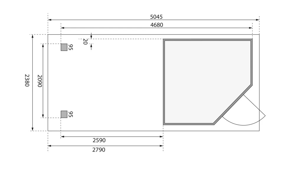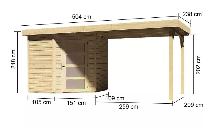 Tato verze domku obsahuje přístavek délky 280 cm montovatelný zprava nebo zleva.