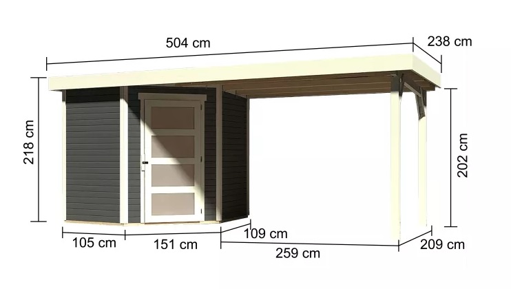 Tato verze domku obsahuje přístavek délky 280 cm montovatelný zprava nebo zleva.