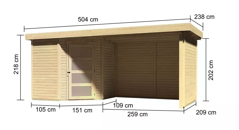 Tato verze domku obsahuje přístavek včetně zadní a boční stěny délky 280 cm montovatelný zprava nebo zleva.