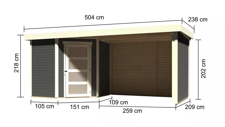 Tato verze domku obsahuje přístavek včetně zadní a boční stěny délky 280 cm montovatelný zprava nebo zleva.