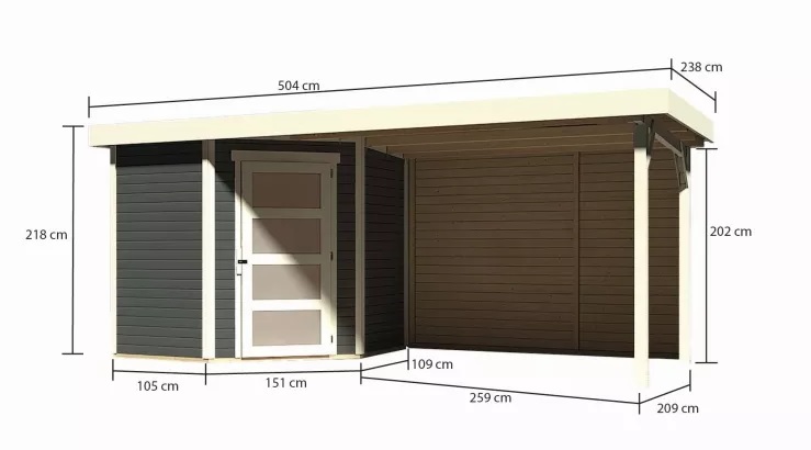 Tato verze domku obsahuje přístavek včetně zadní stěny délky 280 cm montovatelný zprava nebo zleva.