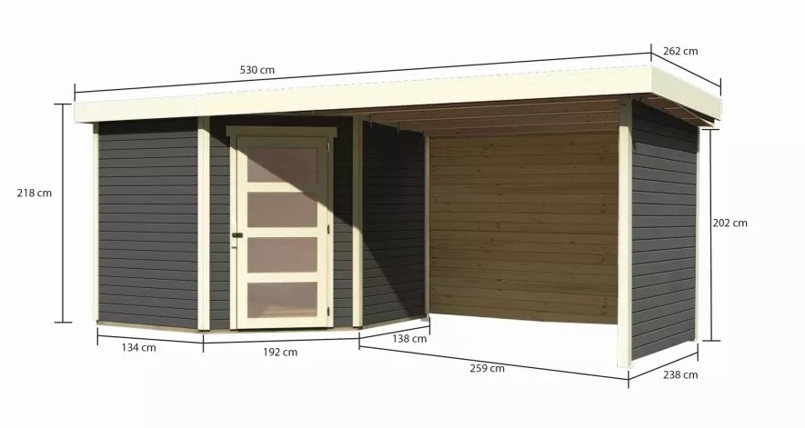 Tato verze domku obsahuje přístavek včetně zadní a boční stěny délky 280 cm montovatelný zprava nebo zleva.