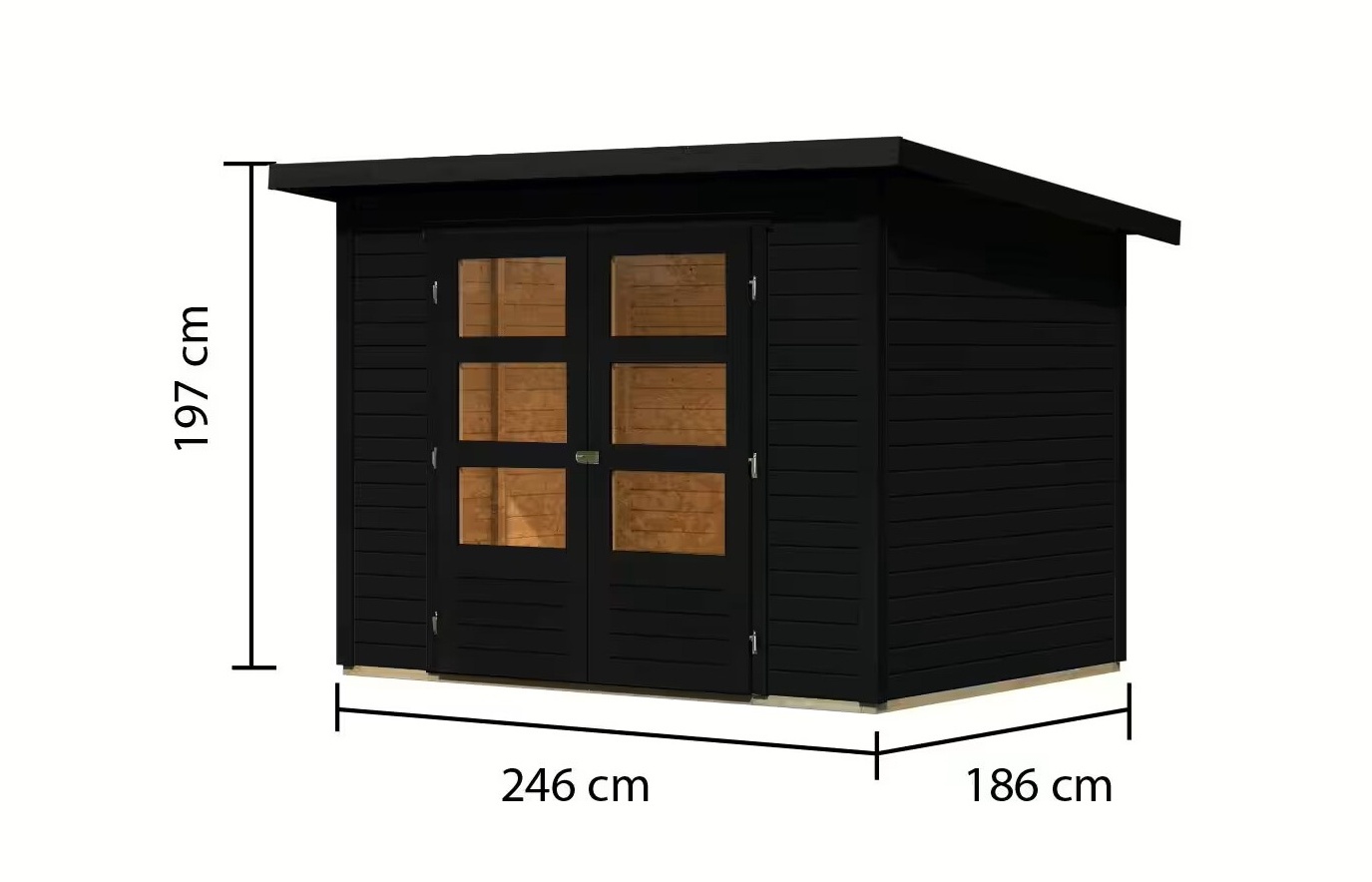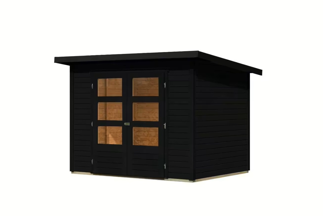 Tento model domku dodáváme v profesionálním nátěru KARIBU (odstín černý RAL 9005):