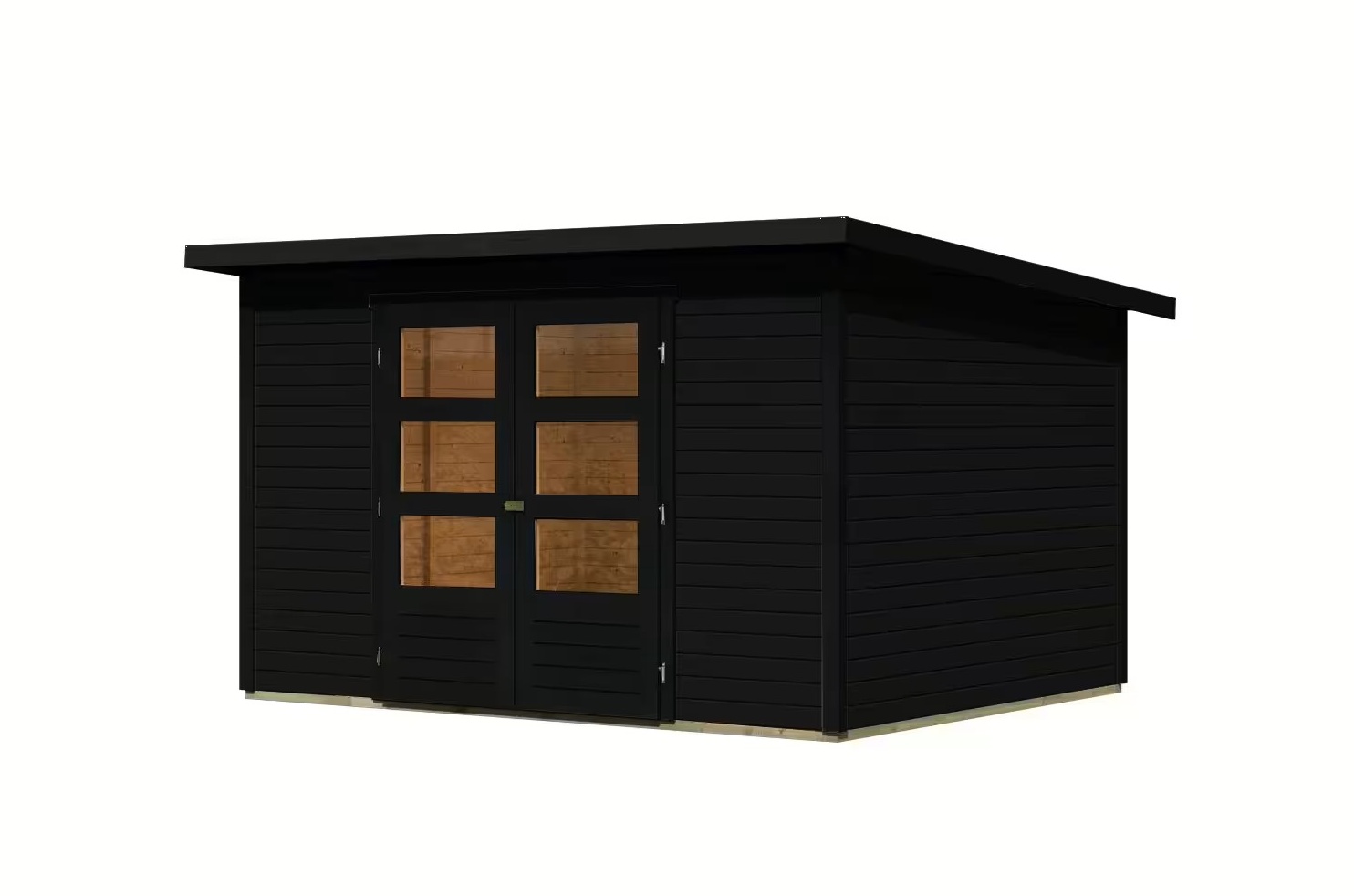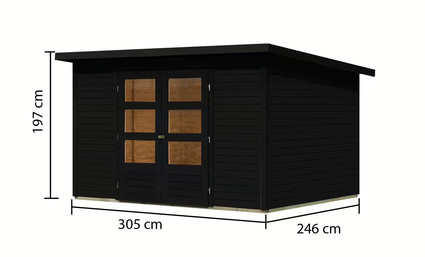 Tento model domku dodáváme v profesionálním nátěru KARIBU (odstín černý RAL 9005):