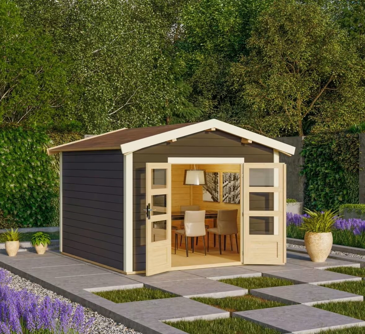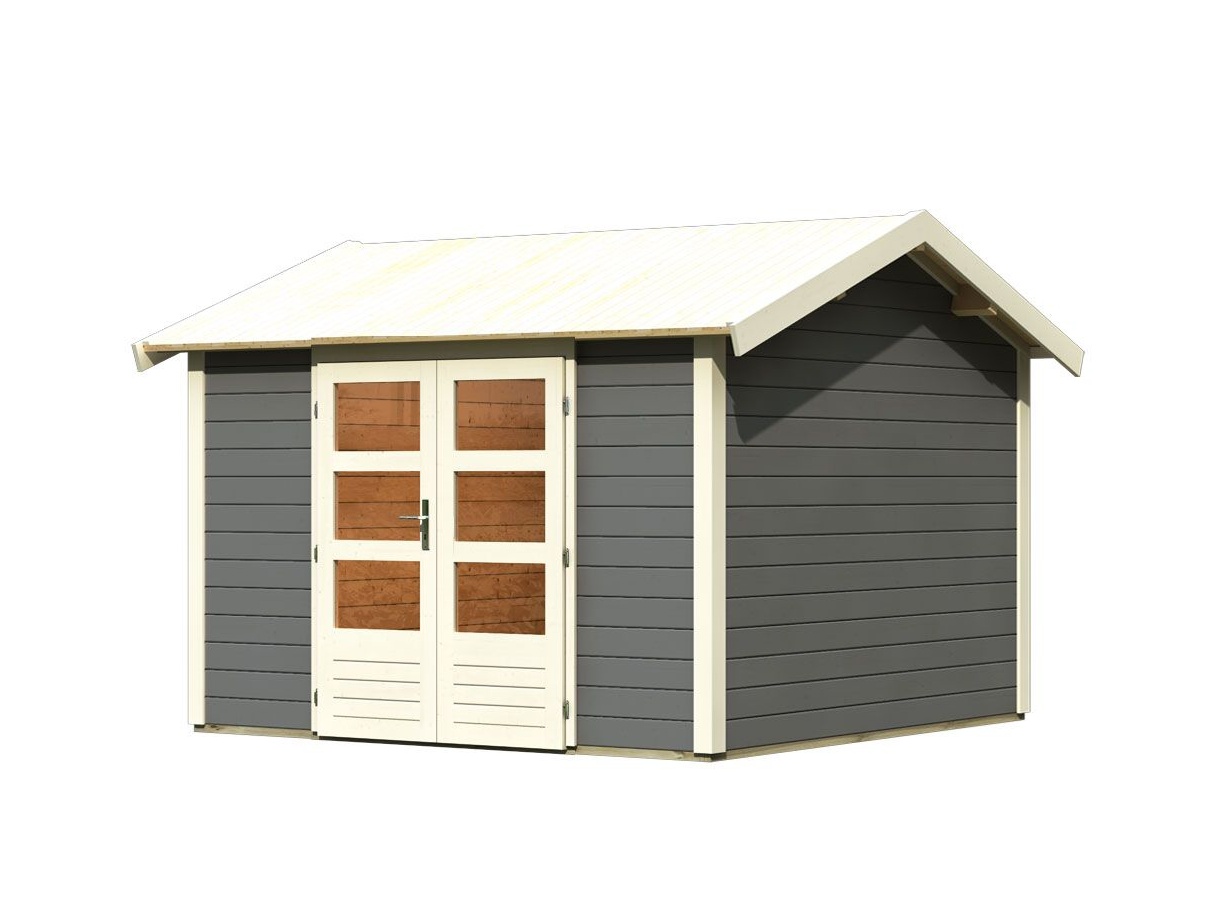 Tento model domku dodáváme v profesionálním nátěru KARIBU (odstín terragrau RAL 0604005):