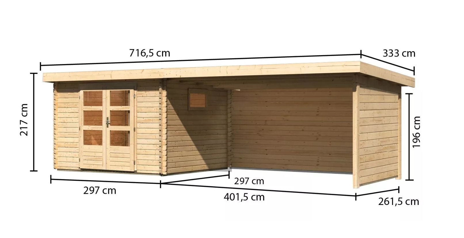 Tato verze domku obsahuje přístavek včetně zadní a boční stěny délky 440 cm montovatelný zprava nebo zleva.