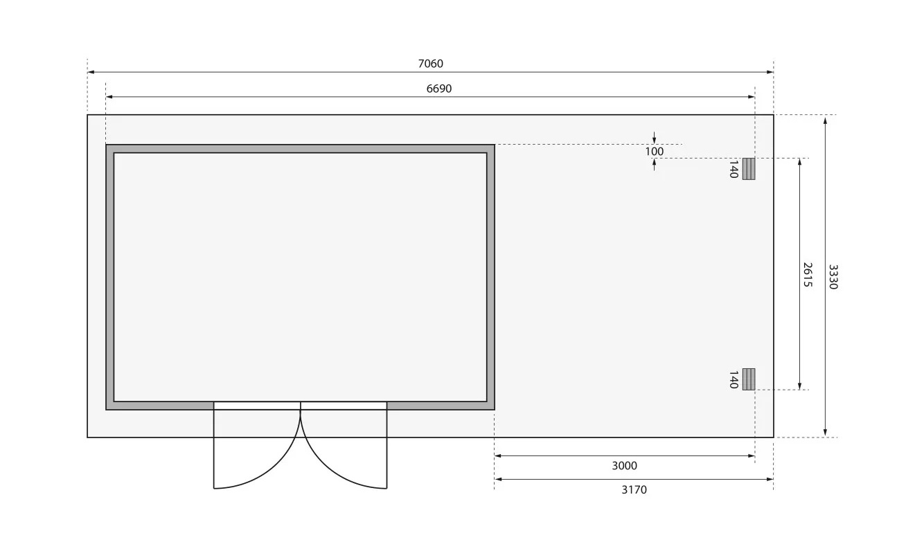 Tato verze domku obsahuje otevřený přístavek délky 330 cm montovatelný zprava nebo zleva.