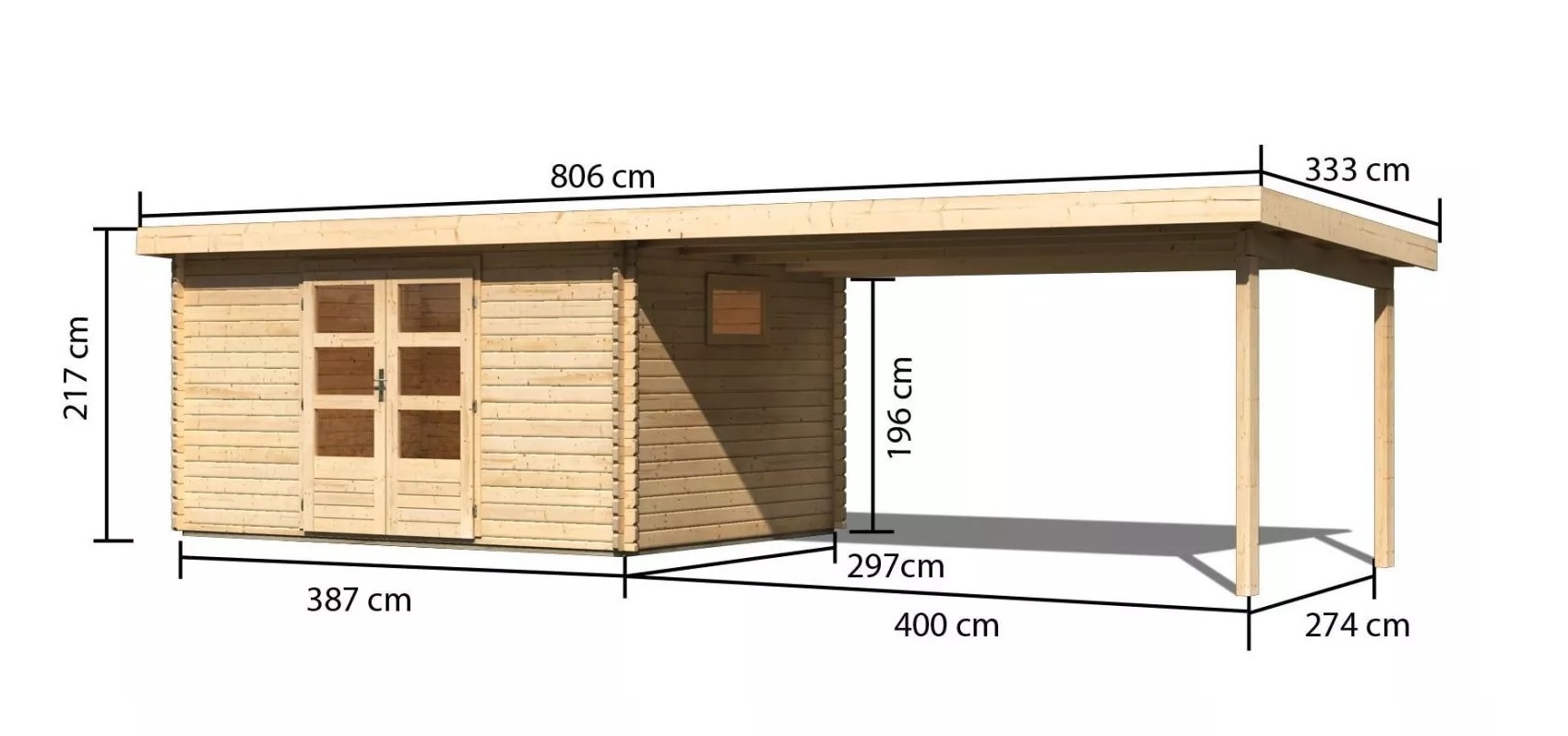 Tato verze domku obsahuje otevřený přístavek délky 440 cm montovatelný zprava nebo zleva.