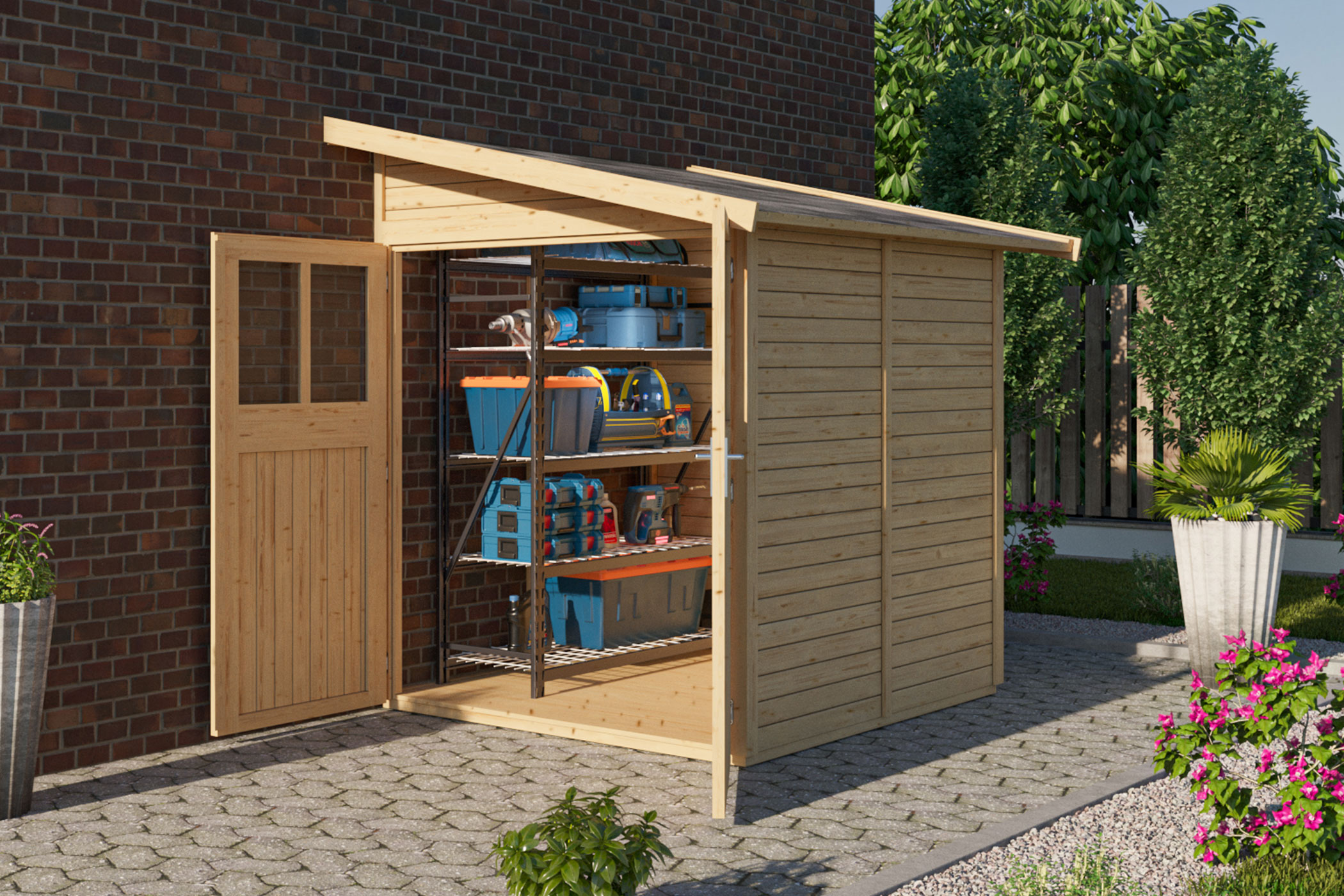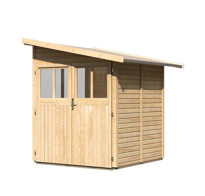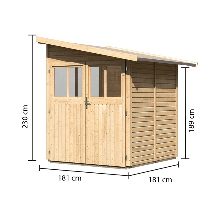 Dřevěný domek ke zdi. V domku můžete uskladnit zahradní techniku, nářadí nebo si v něm vybudovat kutilskou dílnu. Domek má šikmou střechu a jedny dvoukřídlé dveře na pantech s oknem v každém křídle. Stavebním materiálem domku jsou dřevěné profily síly 19 mm perfektně vyfrézované ze severského smrku. Dodáváme jako stavebnici v rozloženém stavu, kde stěny tvoří jednotlivé dřevěné profily, které pouze sesadíte k sobě a sešroubujete, střechu tvoří celistvá deska. To garantuje extrémně jednoduchou montáž, kterou zvládne každý český kutil.