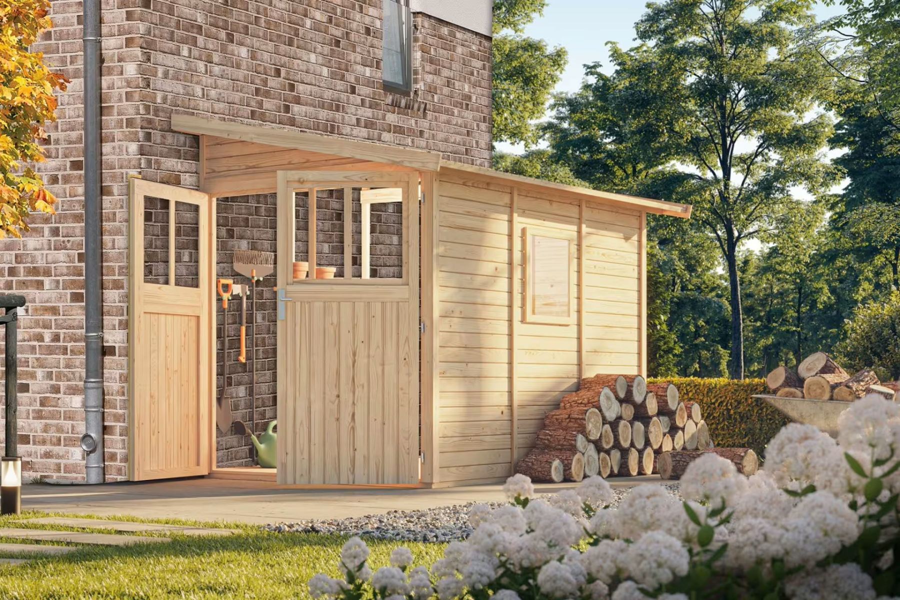 Dřevěný domek ke zdi. V domku můžete uskladnit zahradní techniku, nářadí nebo si v něm vybudovat kutilskou dílnu. Domek má šikmou střechu a jedny dvoukřídlé dveře na pantech s oknem v každém křídle. Stavebním materiálem domku jsou dřevěné profily síly 19 mm perfektně vyfrézované ze severského smrku. Dodáváme jako stavebnici v rozloženém stavu, kde stěny tvoří jednotlivé dřevěné profily, které pouze sesadíte k sobě a sešroubujete, střechu tvoří celistvá deska. To garantuje extrémně jednoduchou montáž, kterou zvládne každý český kutil.