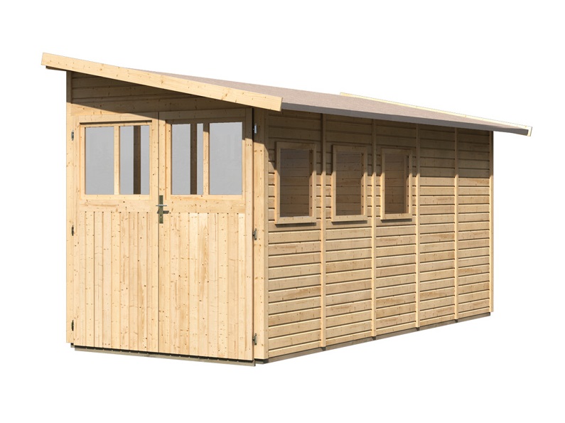 Dřevěný domek ke zdi. V domku můžete uskladnit zahradní techniku, nářadí nebo si v něm vybudovat kutilskou dílnu. Domek má šikmou střechu a jedny dvoukřídlé dveře na pantech s oknem v každém křídle. Stavebním materiálem domku jsou dřevěné profily síly 19 mm perfektně vyfrézované ze severského smrku. Dodáváme jako stavebnici v rozloženém stavu, kde stěny tvoří jednotlivé dřevěné profily, které pouze sesadíte k sobě a sešroubujete, střechu tvoří celistvá deska. To garantuje extrémně jednoduchou montáž, kterou zvládne každý český kutil.