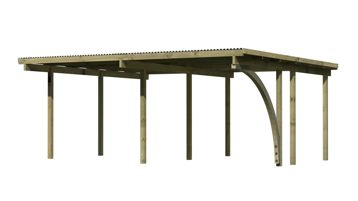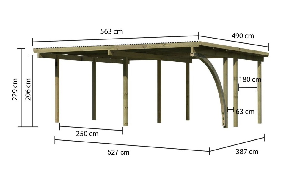 Přístřešek má obdélníkový tvar a svými rozměry vyhovuje většině modelů vozidel běžných na českém trhu. Celková zastřešená plocha je 5,63 x 4,90 m. Průjezdná výška je 206 cm. Střechu podpírá devět dřevěných sloupků 9 x 9 cm. Konstrukce přístřešku je tlakově impregnována a je tak dobře chráněna proti dřevokazným houbám i hmyzu, ale i proti nepříznivým povětrnostním podmínkám. Impregnace je zdravotně nezávadná a naprosto bezpečná. Vzhledem k velkým plochám střechy a zatížení větrem je nutné připevnit přístřešek k zemi pomocí odpovídajících zemních kotev (nejsou obsahem dodávky - lze dokoupit jako příplatkové příslušenství).