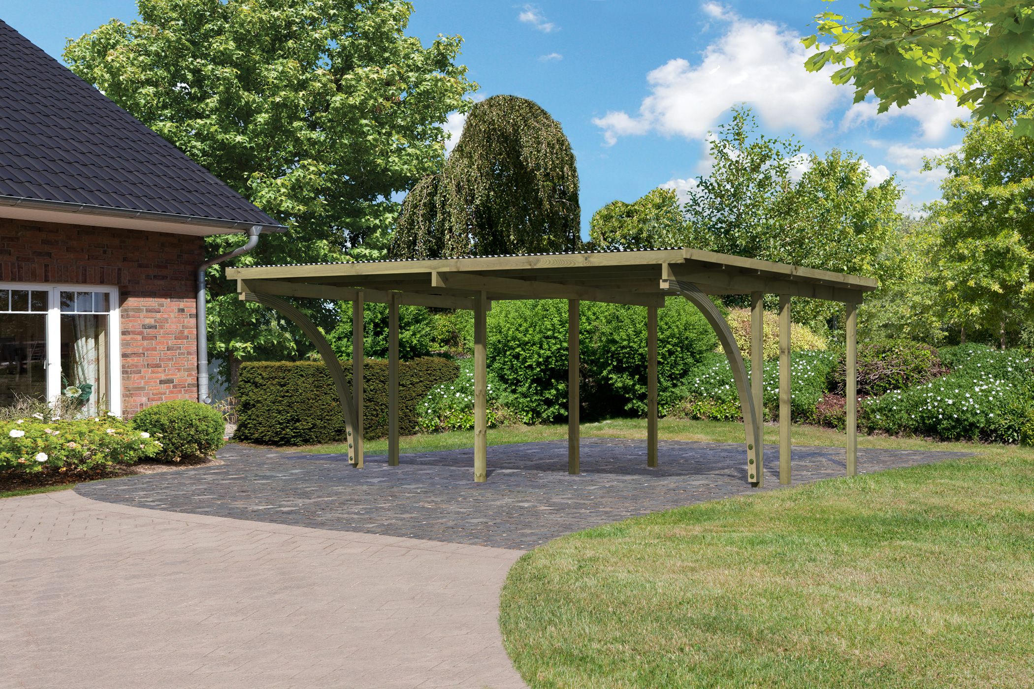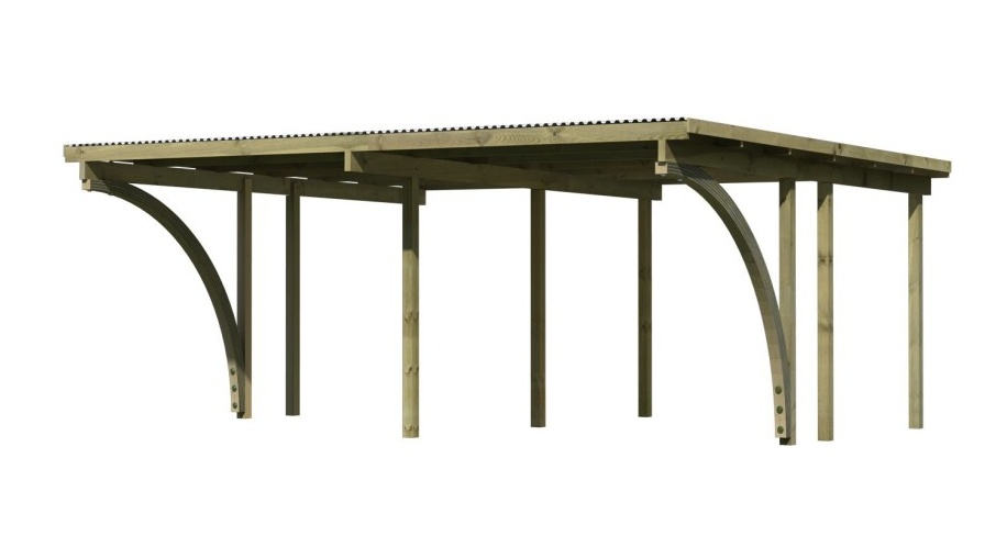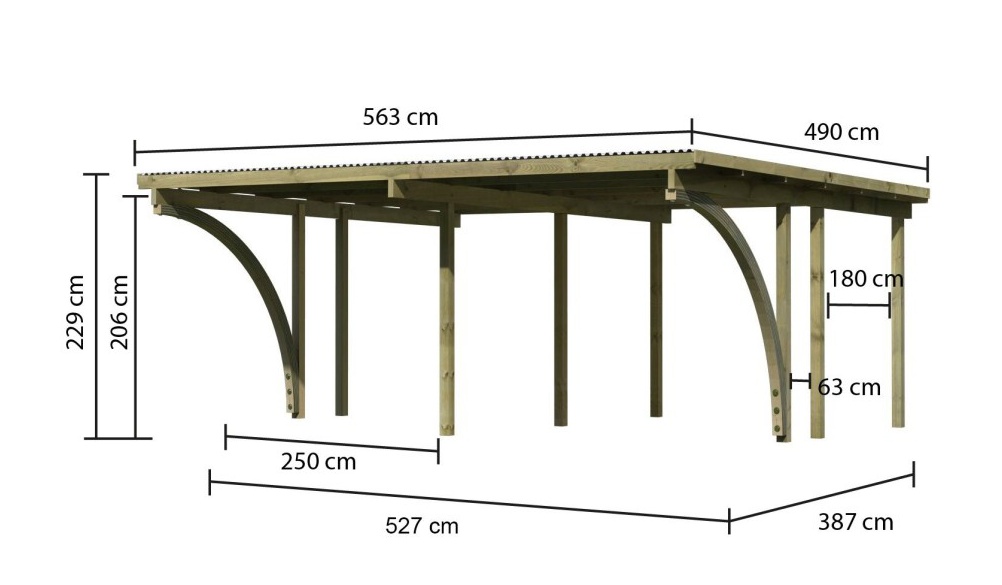 Přístřešek má obdélníkový tvar a svými rozměry vyhovuje většině modelů vozidel běžných na českém trhu. Celková zastřešená plocha je 5,63 x 4,90 m. Průjezdná výška je 206 cm. Střechu podpírá devět dřevěných sloupků 9 x 9 cm. Konstrukce přístřešku je tlakově impregnována a je tak dobře chráněna proti dřevokazným houbám i hmyzu, ale i proti nepříznivým povětrnostním podmínkám. Impregnace je zdravotně nezávadná a naprosto bezpečná. Vzhledem k velkým plochám střechy a zatížení větrem je nutné připevnit přístřešek k zemi pomocí odpovídajících zemních kotev (nejsou obsahem dodávky - lze dokoupit jako příplatkové příslušenství).