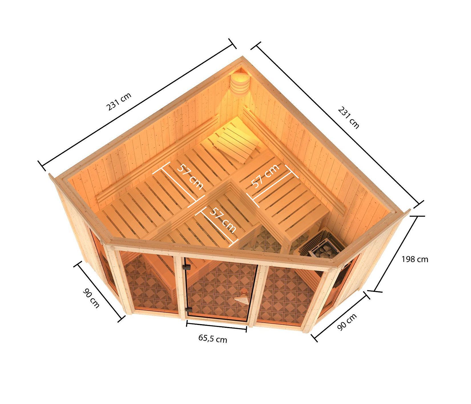 Finská sauna určená pro tři ležící osoby. Má rozměr š 231 x h 231 x v 198 cm s rohovými dveřmi. Tento model finské sauny má 4x pevné okno. Sauna je určená do temperovaných interiérů domu nebo bytu. Její výrobce, firma KARIBU HOLZTECHNIK z německých Brém, dokázala svými výrobky úspěšně navázat na staletou tradici skandinávského saunování a současně do ní zapracovat dnešní moderní technologie.