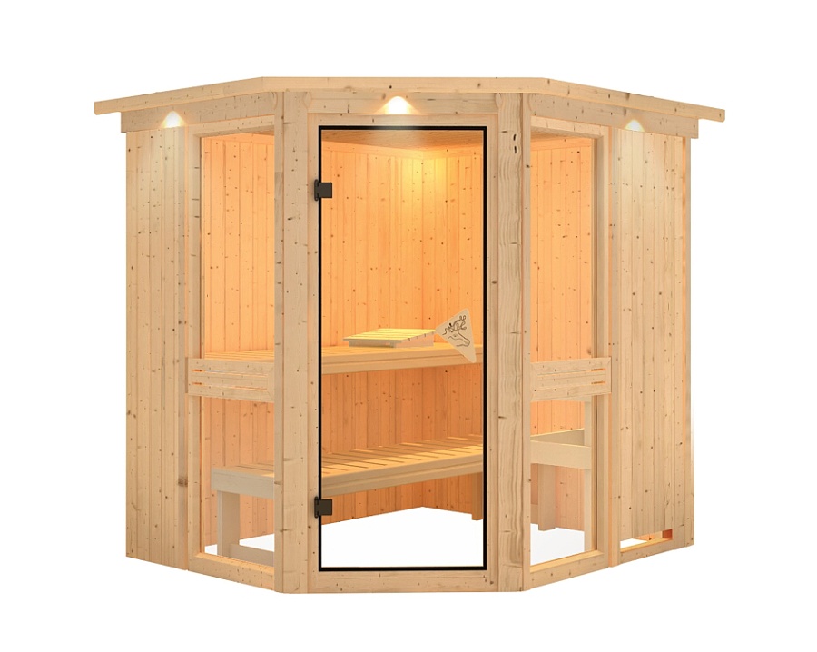 Finská sauna určená pro dvě ležící osoby. Má rozměr š 210 x h 184 x v 202 cm. Tento model finské sauny je určený do temperovaných interiérů domu nebo bytu. Stropní římsa včetně 3 LED světel šikovně dotváří atmosféru sauny. Její výrobce, firma KARIBU HOLZTECHNIK z německých Brém, dokázala svými výrobky úspěšně navázat na staletou tradici skandinávského saunování a současně do ní zapracovat dnešní moderní technologie. Sauna je celá vyrobena ze dřeva severského smrku v přírodním provedení. Dřevo pochází ze vzdáleného severu Evropy a je chemicky naprosto neošetřené (není ani namořeno ani nalakováno). V důsledku toho je prosté všech známých problematických látek, které by se v průběhu saunování mohly ze dřeva uvolňovat. Tato interiérová sauna vykazuje mimořádné tepelně-izolační vlastnosti. Stěny sauny jsou složeny z vnitřní a vnější vrstvy speciálně hlazených prken s perem a drážkou, mezi kterými je 42 mm silná tepelná izolace v podobě minerální vlny. Celková síla stěny je tak 68 mm. Zadní nebo boční nepohledové strany orientované ke stěně místnosti mají vnější stranu ze sololitu. Proto jsou při stejné tepelné izolaci o cca 10 mm tenčí než pohledové strany pokryté palubkami.