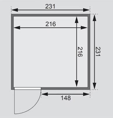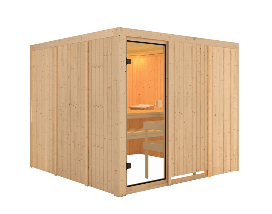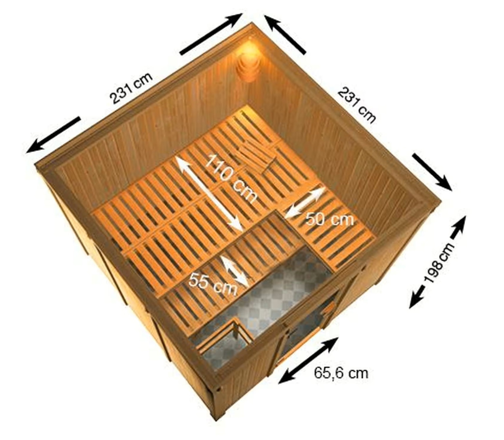 Finská sauna určená pro tři ležící osoby. Má rozměry š 231 x h 231 x v 198 cm. Tento model finské sauny je určený do temperovaných interiérů domu nebo bytu. Její výrobce, firma KARIBU HOLZTECHNIK z německých Brém, dokázala svými výrobky úspěšně navázat na staletou tradici skandinávského saunování a současně do ní zapracovat dnešní moderní technologie. Sauna je celá vyrobena ze dřeva severského smrku v přírodním provedení. Dřevo pochází ze vzdáleného severu Evropy a je chemicky naprosto neošetřené (není ani namořeno ani nalakováno). V důsledku toho je prosté všech známých problematických látek, které by se v průběhu saunování mohly ze dřeva uvolňovat. Tato interiérová sauna vykazuje mimořádné tepelně-izolační vlastnosti. Stěny sauny jsou složeny z vnitřní a vnější vrstvy speciálně hlazených prken s perem a drážkou, mezi kterými je 42 mm silná tepelná izolace v podobě minerální vlny. Celková síla stěny je tak 68 mm. Zadní nebo boční nepohledové strany orientované ke stěně místnosti mají vnější stranu ze sololitu. Proto jsou při stejné tepelné izolaci o cca 10 mm tenčí než pohledové strany pokryté palubkami.
