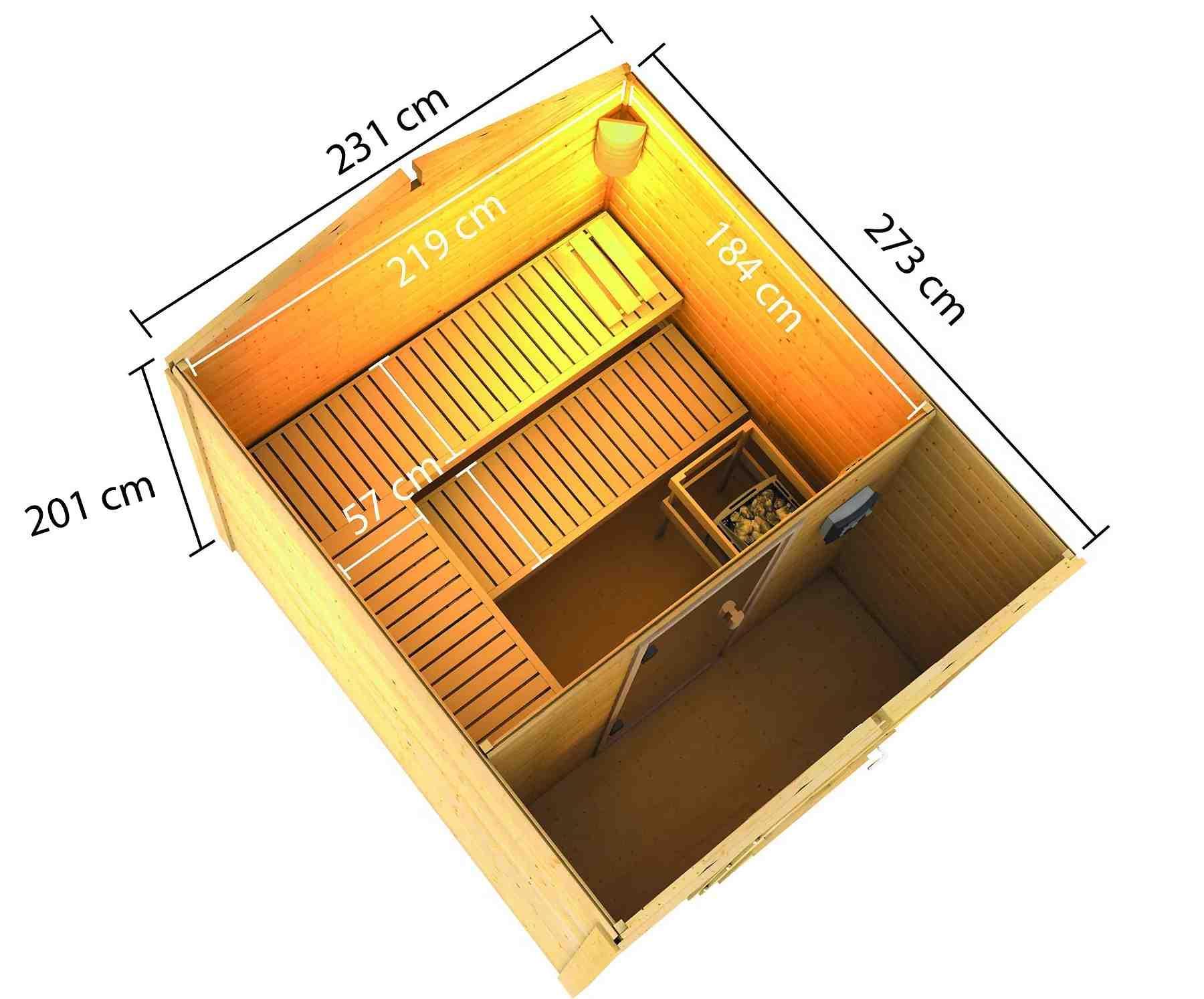 Venkovní model finské sauny pro vaši zahradu. Sauna je určená pro 3 ležící osoby. Moderní design s chromovými rohovými lištami. Její výrobce, firma KARIBU HOLZTECHNIK z německých Brém, dokázala svými výrobky úspěšně navázat na staletou tradici skandinávského saunování a současně do ní zapracovat dnešní moderní technologie. Dodáváme jako stavebnici v rozloženém stavu, kde stěny tvoří jednotlivé dřevěné profily, které pouze sesadíte k sobě a sešroubujete. To garantuje jednoduchou montáž, kterou zvládne každý domácí kutil. Stěny sauny jsou složeny ze speciálně hlazených prken s dvojitým perem a drážkou, což garantuje neobyčejnou pevnost spoje. Aby teplo z vnitřních prostor sauny nemohlo unikat, je instalován druhý strop z rámové konstrukce s minerální izolační vatou o tloušťce 42 mm.