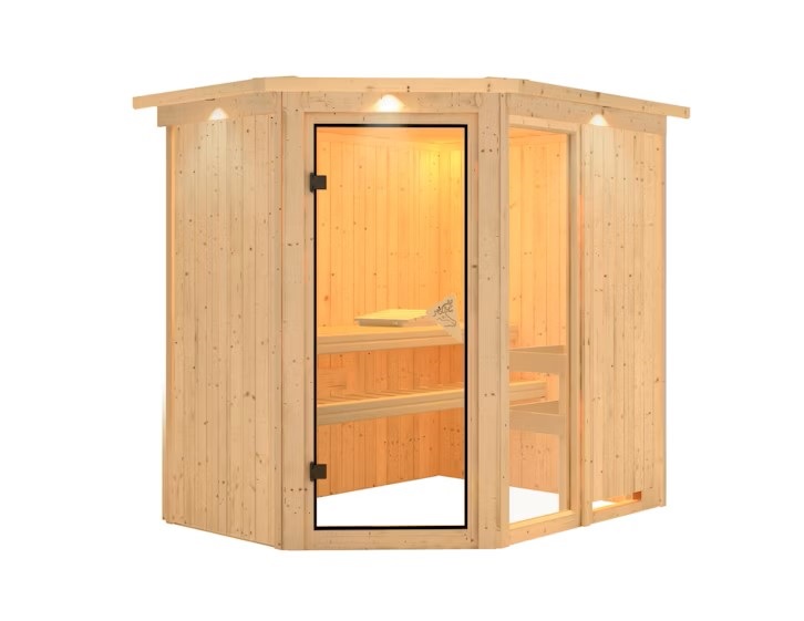 Menší finská sauna určená pro dvě osoby. Má rozměr š 196 x h 151 x v 198 cm s rohovými dveřmi. Tento model finské sauny má 1 okno o rozměru š 49 x v 175,5 cm. Sauna je určená do temperovaných interiérů domu nebo bytu. Její výrobce, firma KARIBU HOLZTECHNIK z německých Brém, dokázala svými výrobky úspěšně navázat na staletou tradici skandinávského saunování a současně do ní zapracovat dnešní moderní technologie.